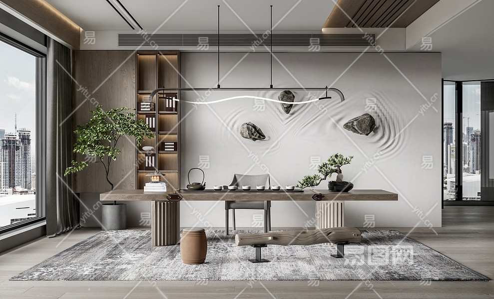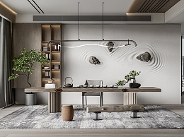 新中式茶室 茶桌椅组合 吊灯 盆栽 摆柜 茶具 墙饰