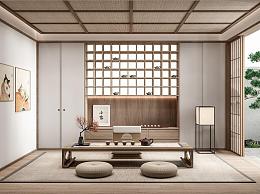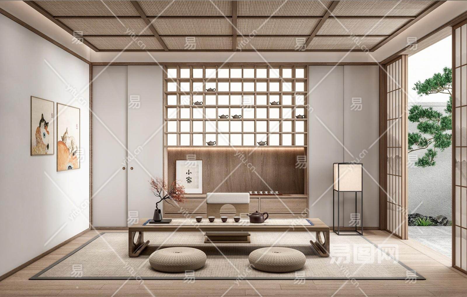 日式榻榻米茶室 茶台 茶桌椅 隔断移门 装饰画 落地灯 蒲团