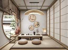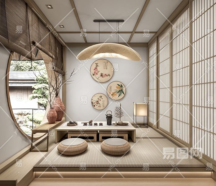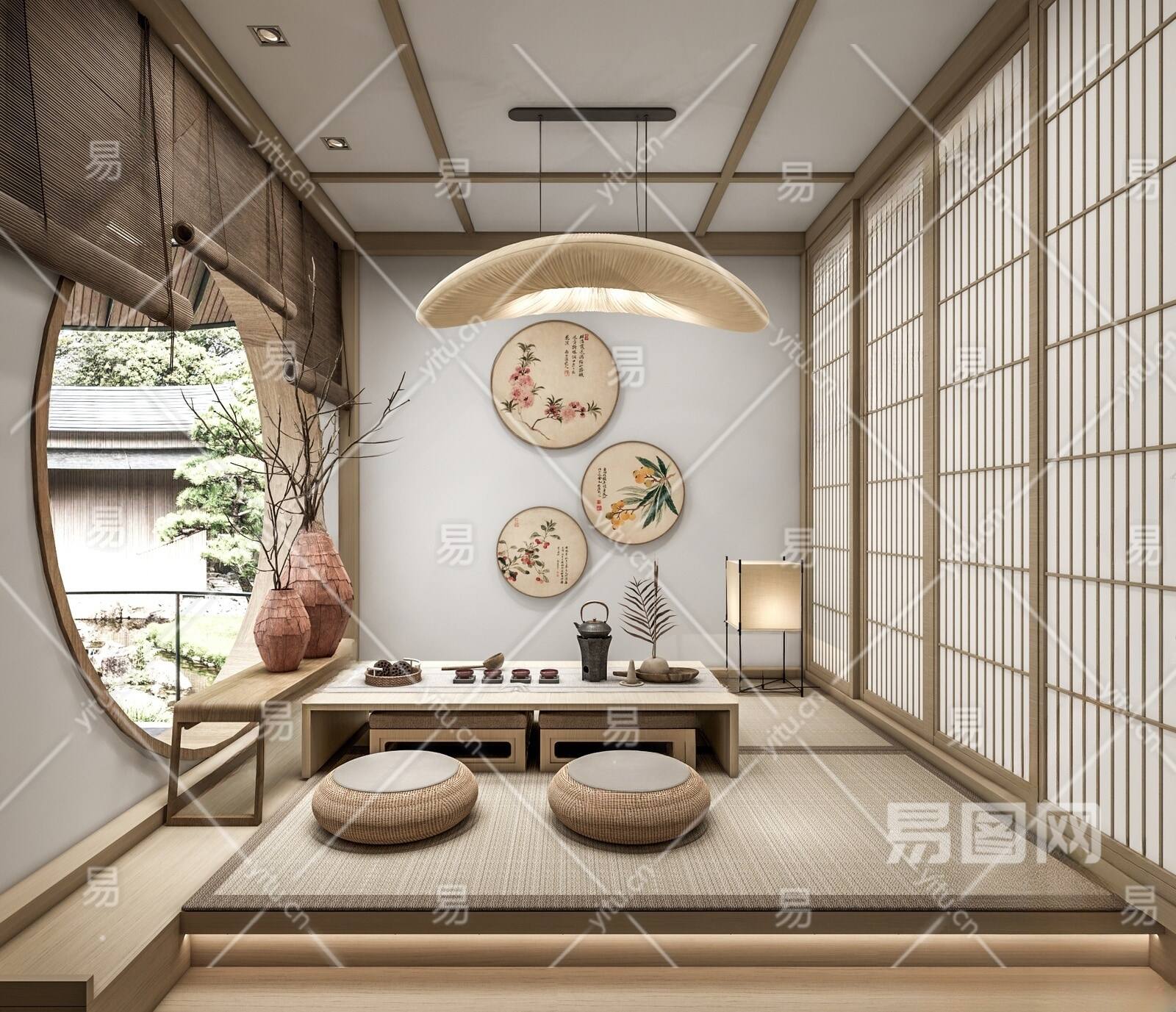 日式榻榻米茶室 茶桌椅 坐垫 茶台 吊灯 墙饰挂画