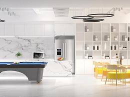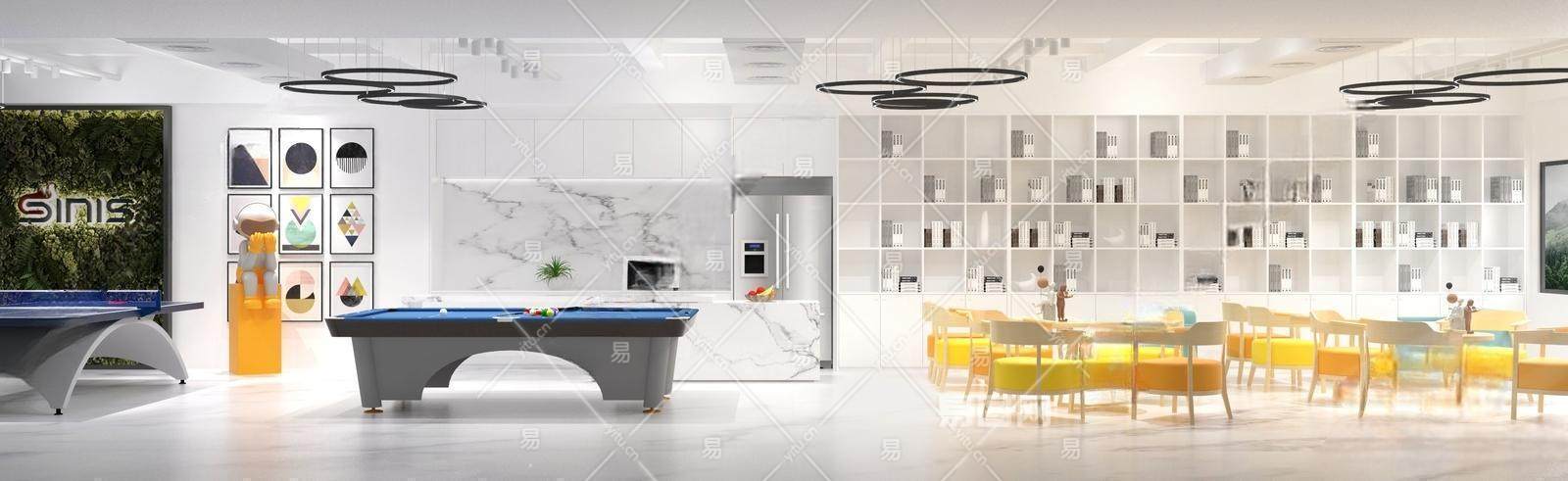 北欧茶水间 休闲室 台球 乒乓球 吧台 洽谈 书柜 展示柜