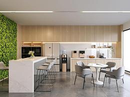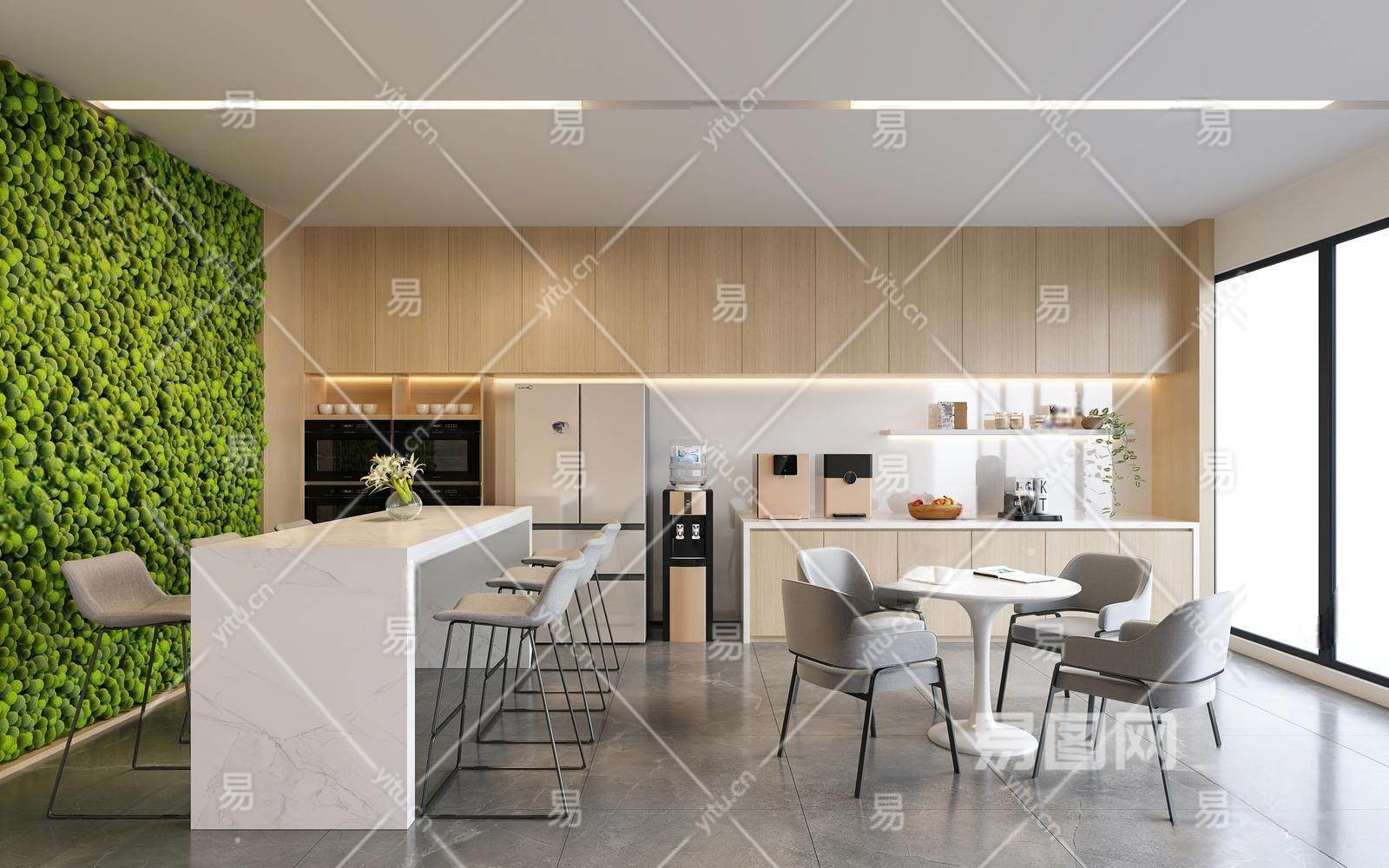 现代办公茶水间 饮水机 杯子 吧台 苔藓 植物墙