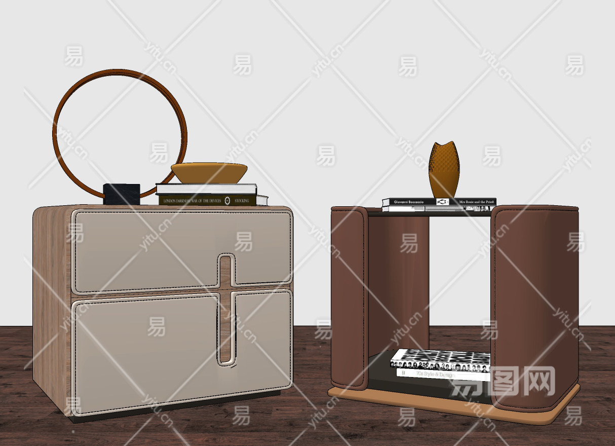 现代皮革床头柜,圆形台灯,艺术摆件su草图模型下载