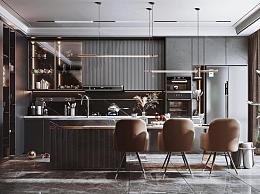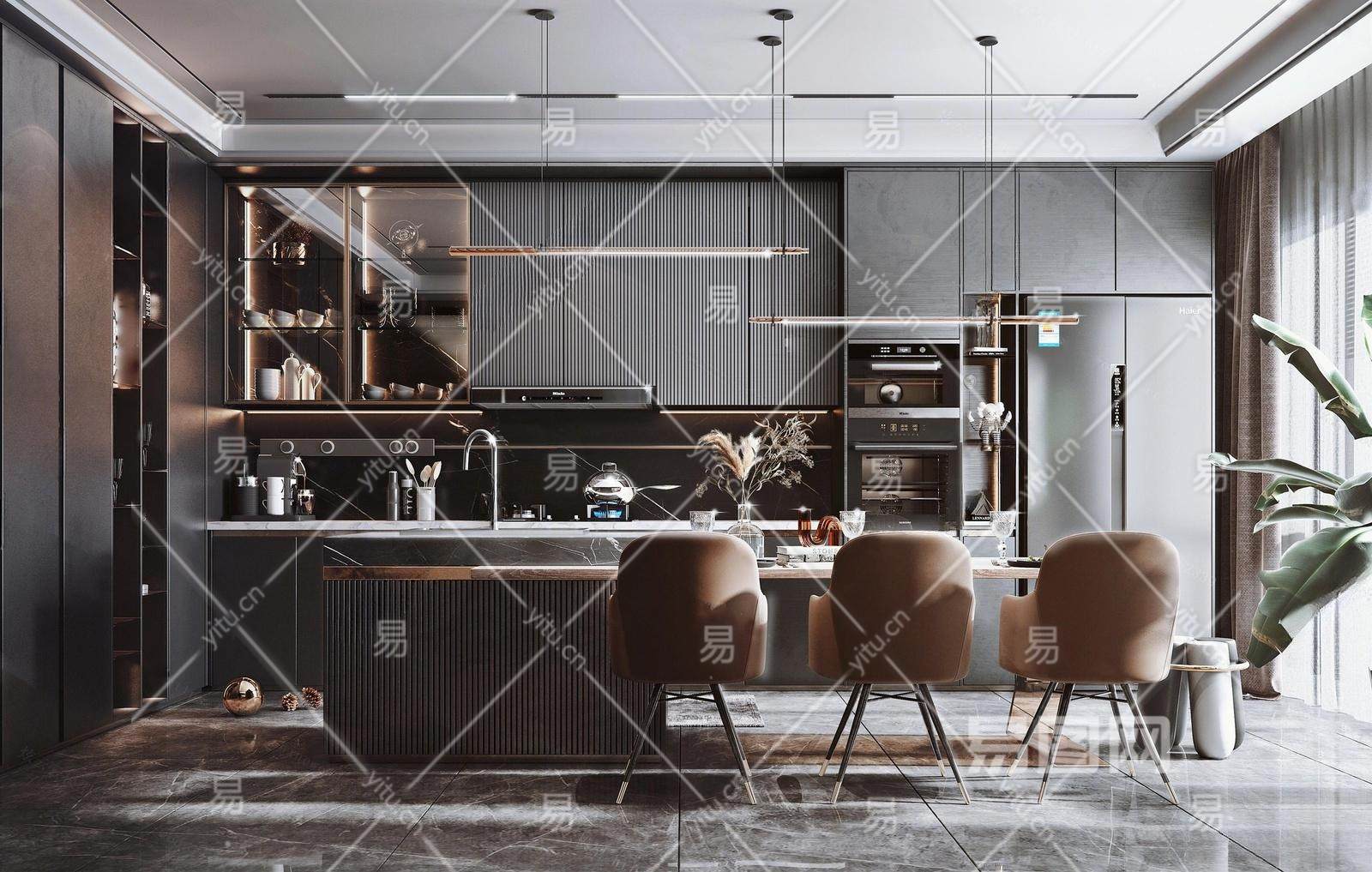 现代家居开放厨房 餐厅 酒柜 餐桌椅