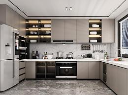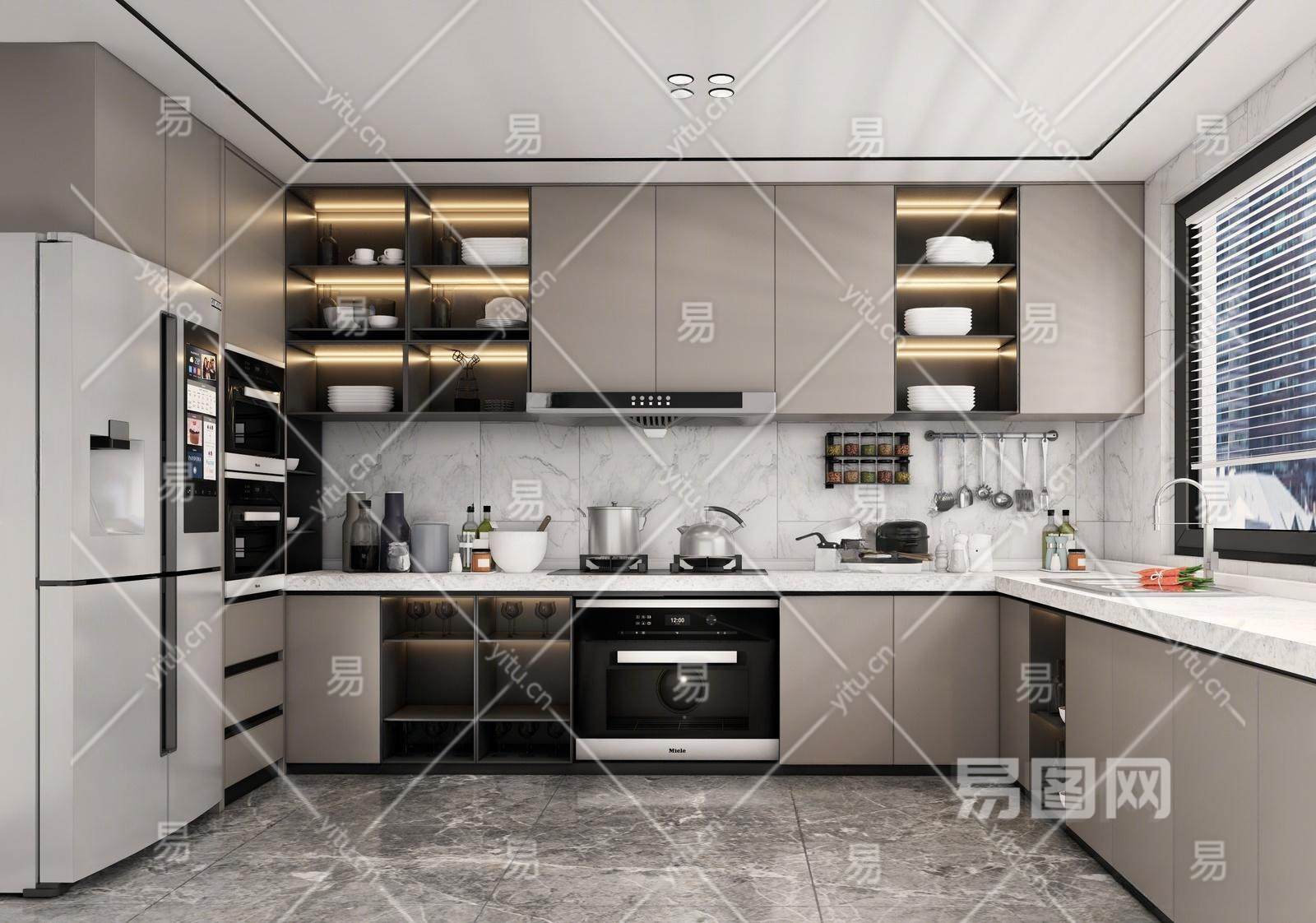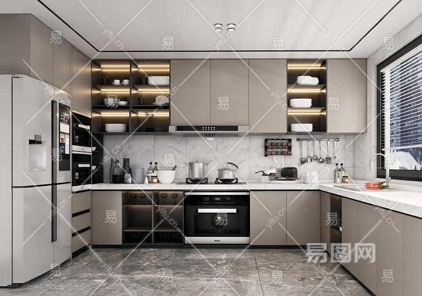 现代封闭厨房 冰箱 洗碗机 烤箱 吊柜 油烟机 微波炉
