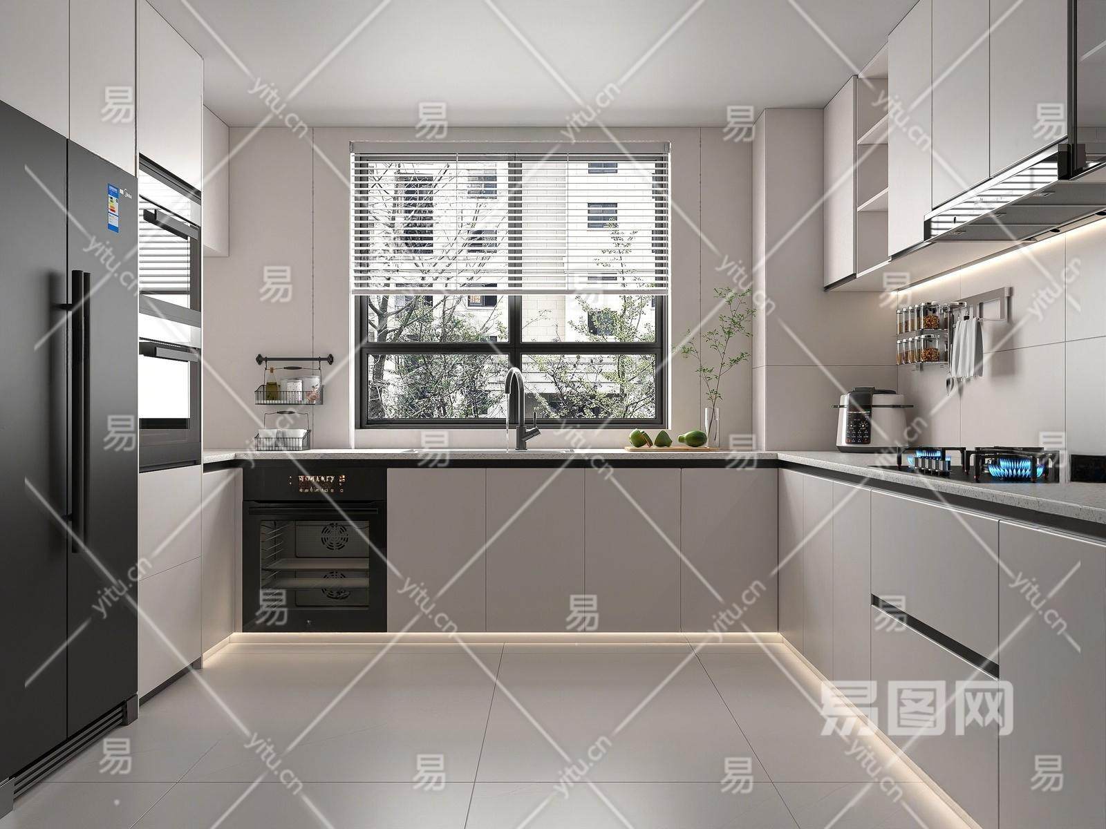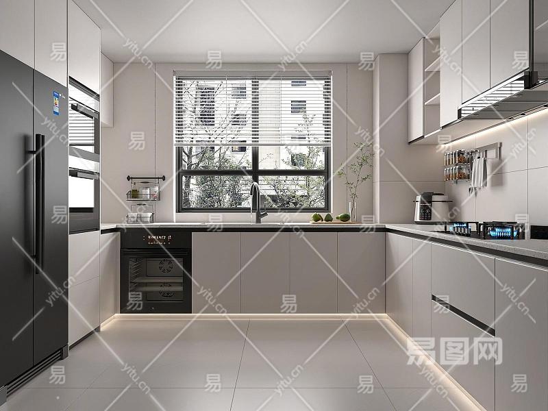 现代封闭式厨房 厨房用品 厨房摆件 燃气灶 烤箱 冰箱 洗碗机 橱柜