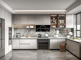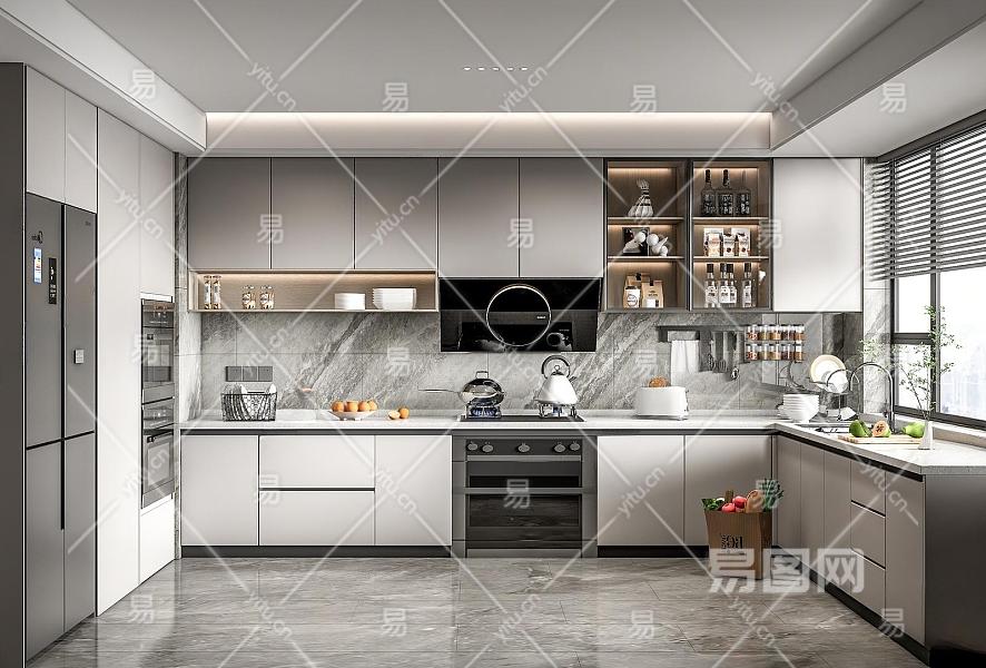 现代封闭式厨房 橱柜 煤气灶油烟机 厨具摆件