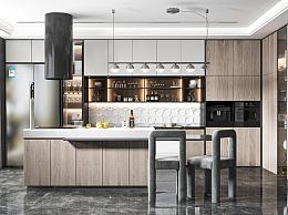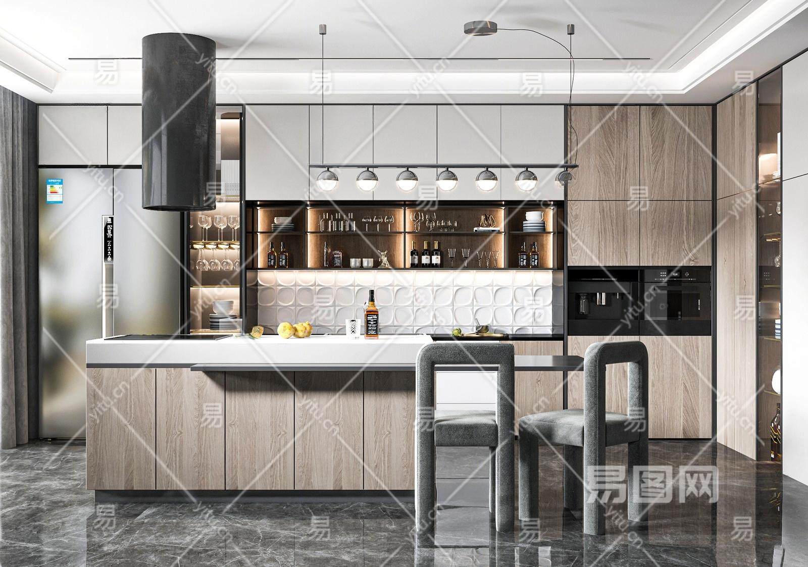 现代开放厨房 厨房 橱柜 餐桌椅 餐椅 餐柜 吊灯 台面 餐具 西厨