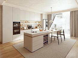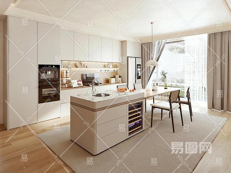 现代开放式厨房 餐厅 橱柜 岛台 椅子 吊灯 厨具 餐具 烤箱 咖啡机