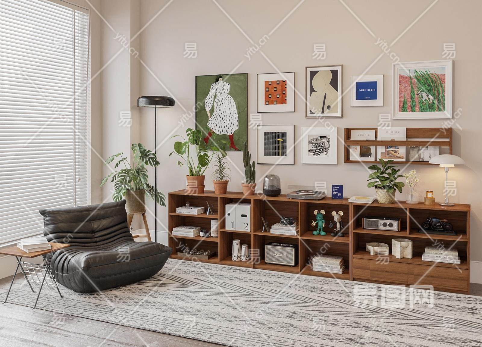 09现代中古风休闲储物柜,懒人沙发,装饰画SU模型