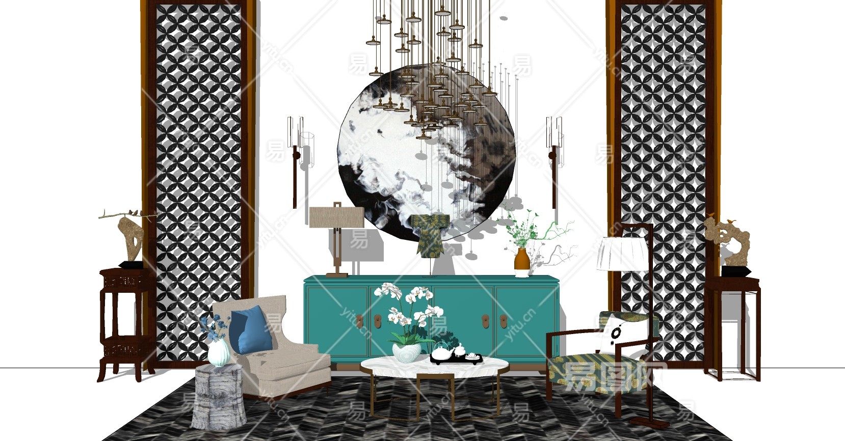4新中式客厅单人休闲椅子沙发茶几兰花玉兰花壁灯吊灯玄关柜端景台边柜花架摆台花格su草图模型下载