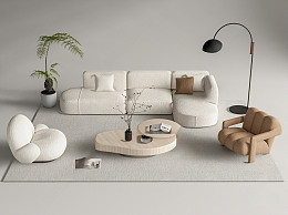 现代奶油色沙发茶几组合 多人沙发 单人沙发 落地灯 盆栽
