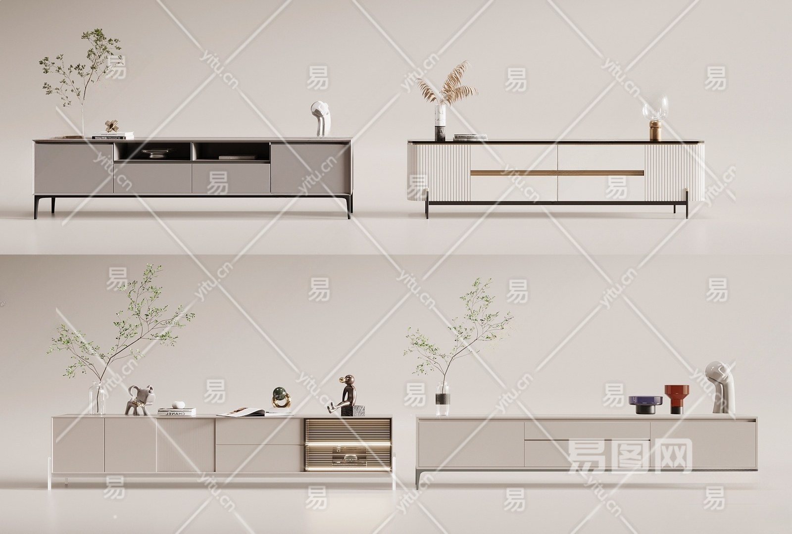 现代奶油风电视柜 地柜式 木材 玻璃 金属