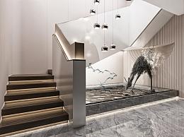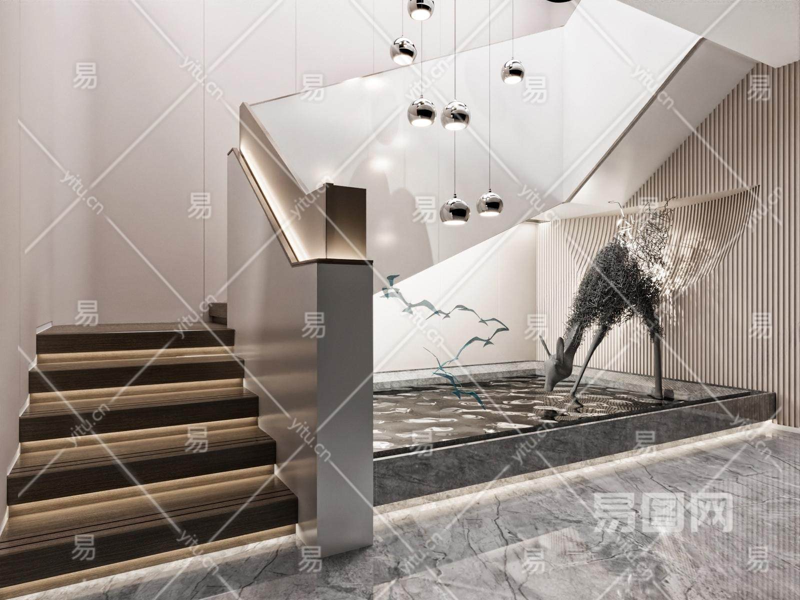 现代楼梯造景 室内景观 景观小品 吊灯 楼梯扶手 雕塑 燕子 水面小景
