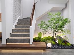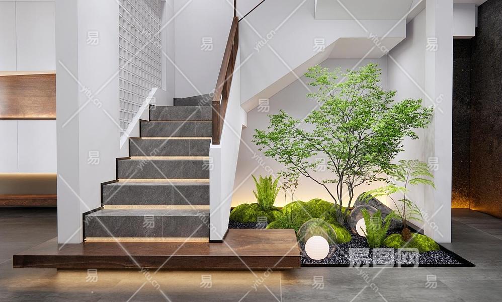 现代楼梯间 室内植物造景 石头 植物堆 乔木