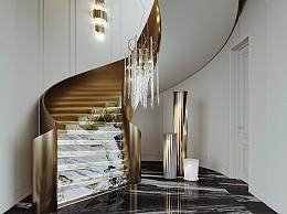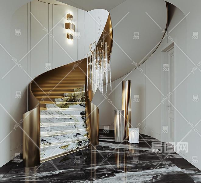 现代楼梯间 旋转楼梯 雕塑摆件 吊灯 壁灯