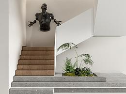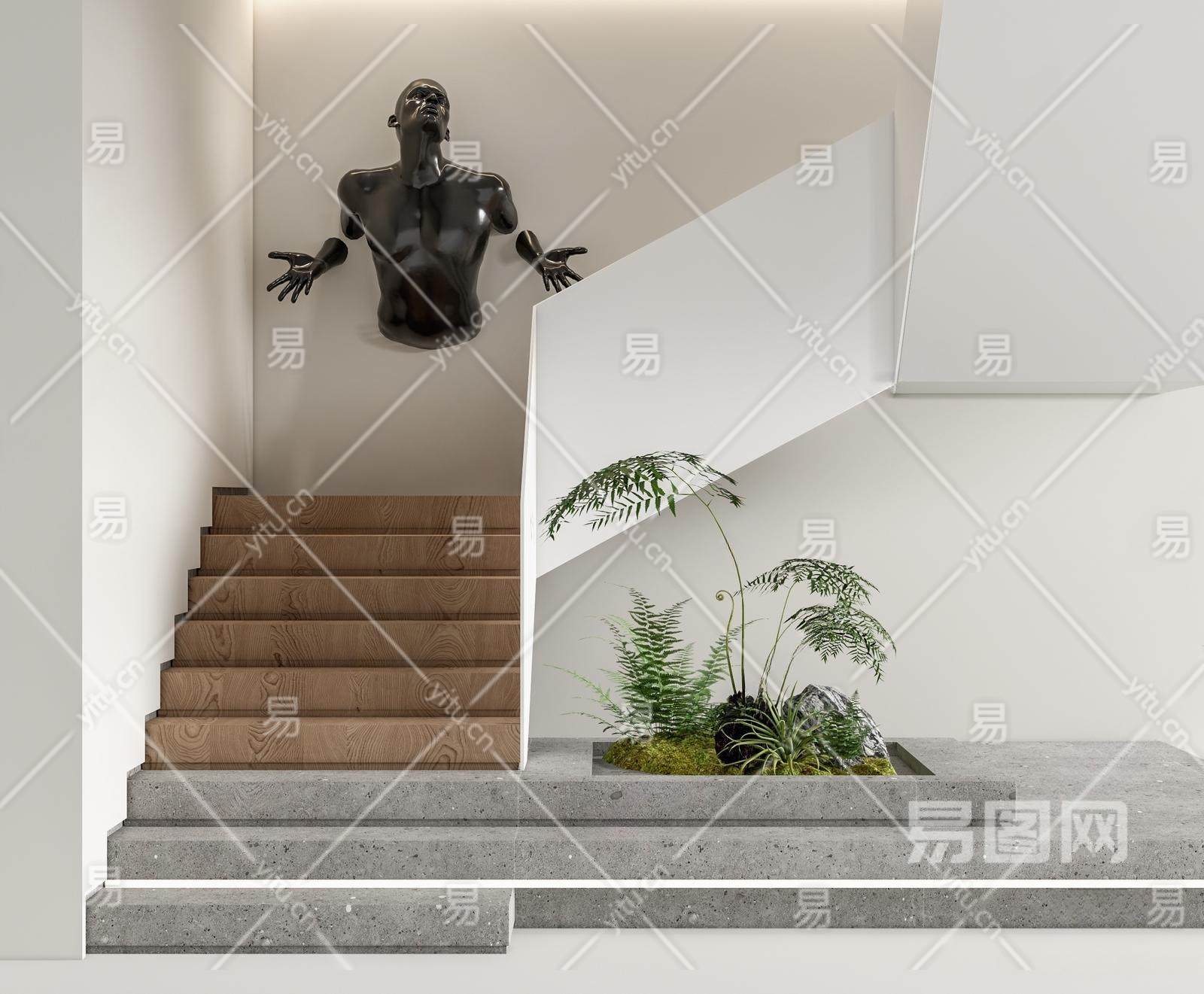 现代楼梯间 转角楼梯 扶手楼梯 雕塑摆件 植物堆 蕨类盆栽