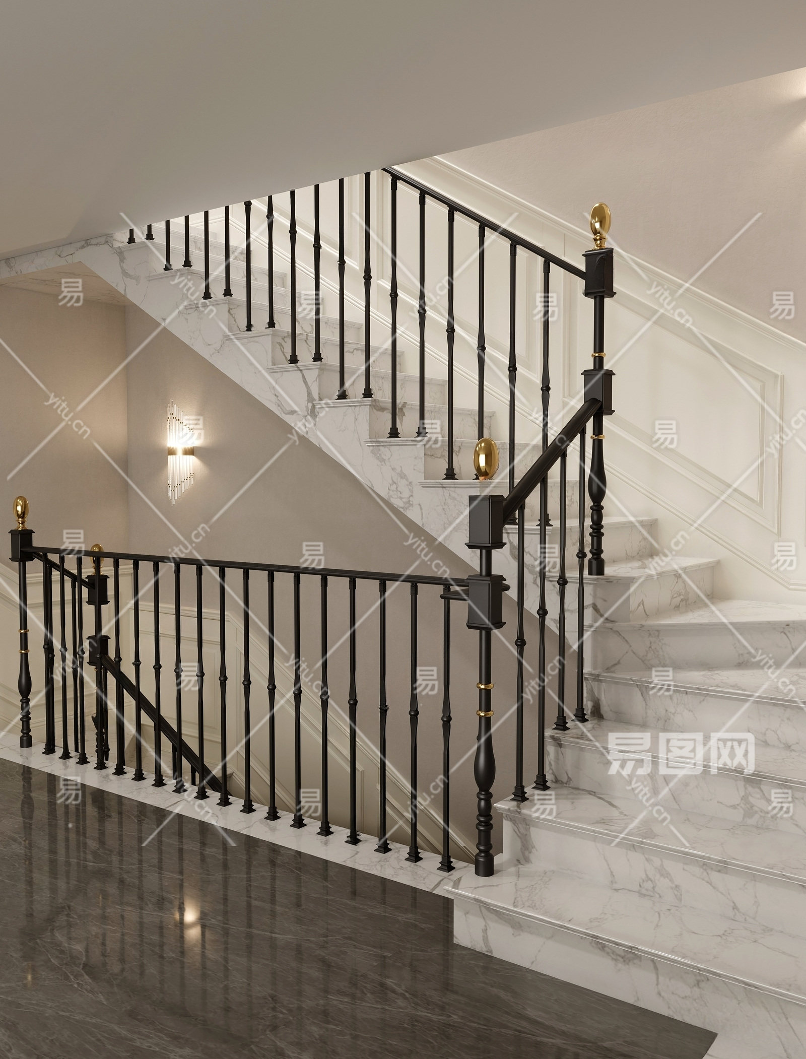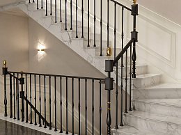 美式楼梯间 扶手楼梯 铁艺立柱
