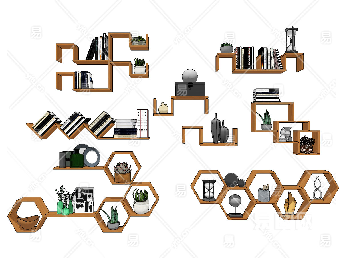 现代实木书架壁柜摆件,吊柜su草图模型下载