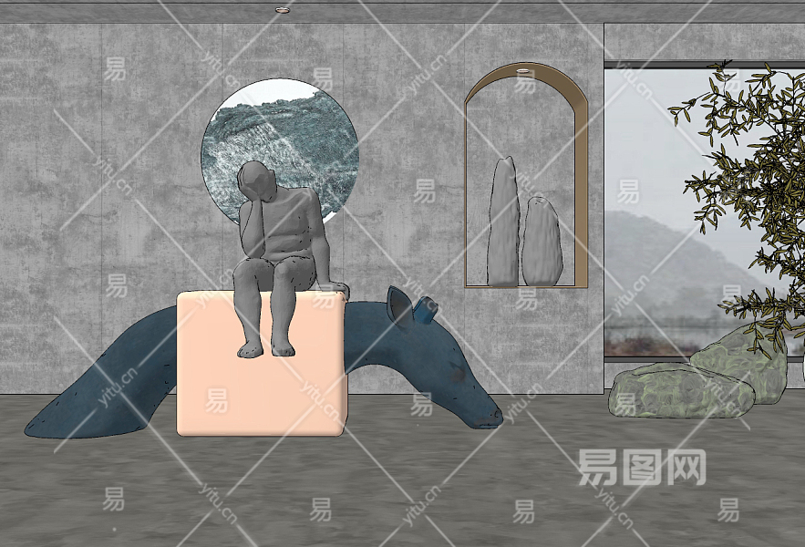 现代长颈鹿人物雕塑,墙饰,石头su草图模型下载