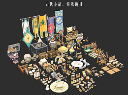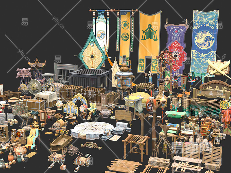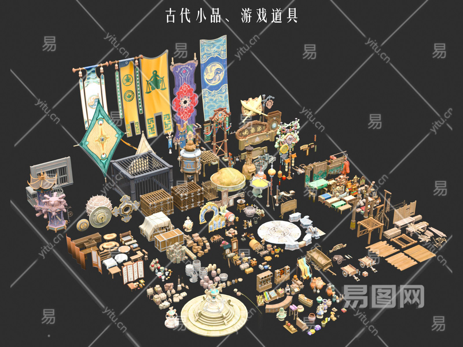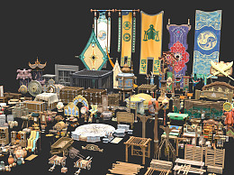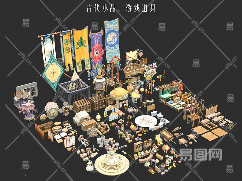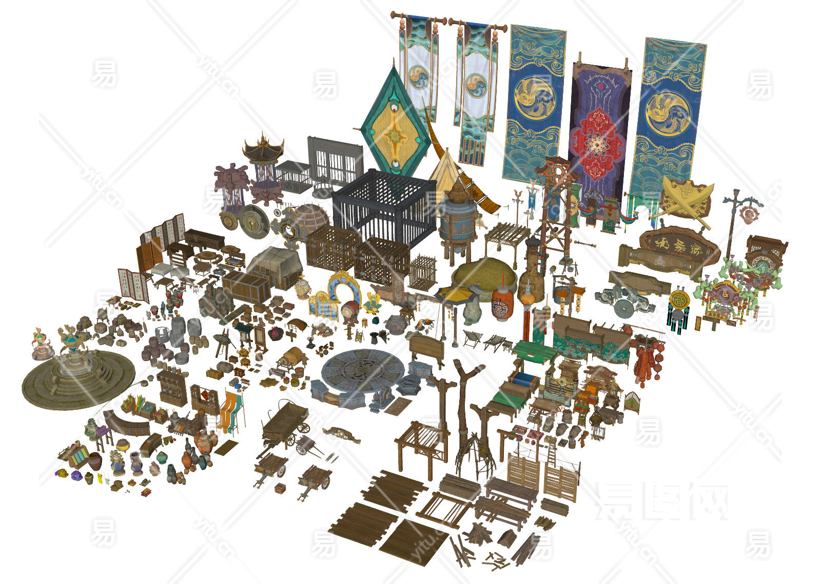 中式古代小品 游戏玄幻道具 牌匾旗帜货架牢笼 亭子水景祭坛 摊位售卖亭箱子