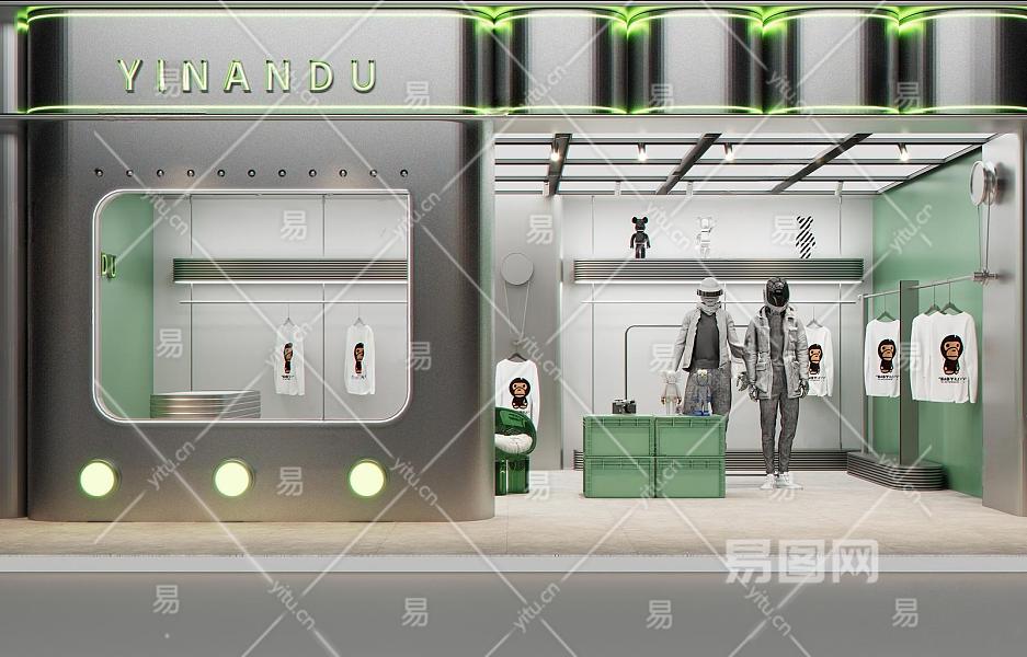 现代潮牌服装店 门面招牌 橱窗 不锈钢货架 展台 模特 收银台