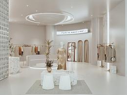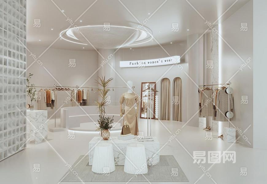 侘寂风女装服装店 圆形卡座休息区 全身镜 服装货架 中岛展台 空心砖隔断
