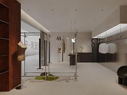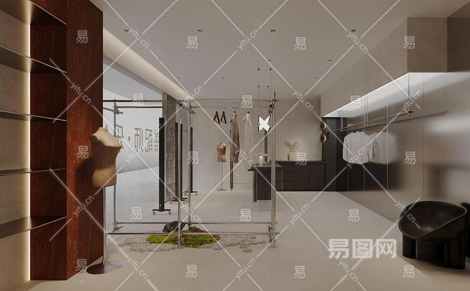 现代服装箱包店 服装店 衣架 休闲椅 前台 商业空间