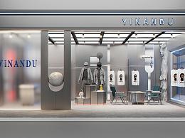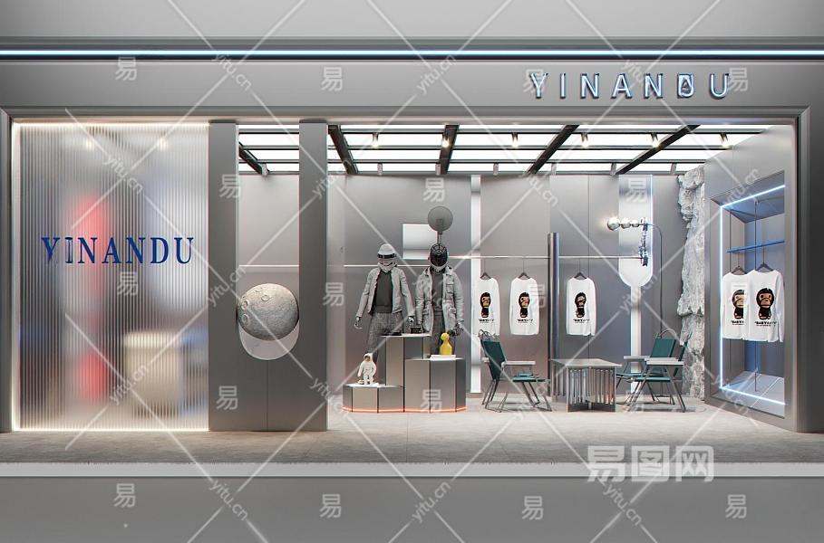 现代科技风潮牌服装店 模特 服装货架 阳光板橱窗 门面招牌