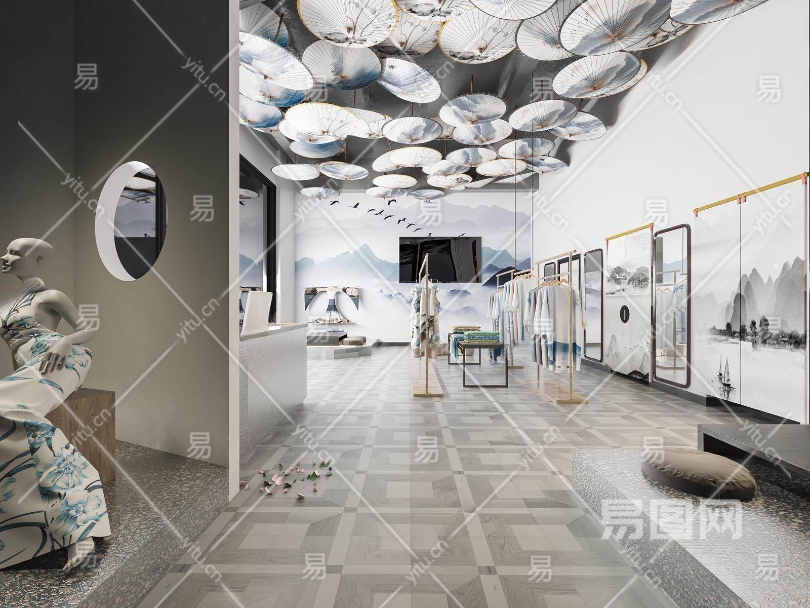 当前的位置:首页 > sketchup > sketchup模型 > 商业空间 > 服装店 > 新中式服装店 异形展柜 衣服 中岛展台 油纸伞