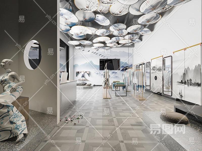 新中式服装店 异形展柜 衣服 中岛展台 油纸伞