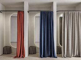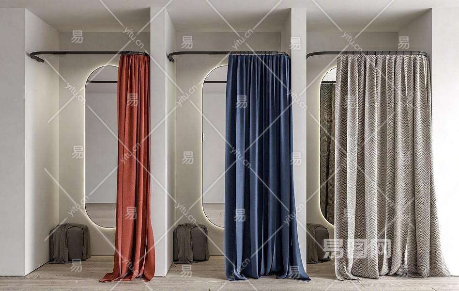 现代服装店试衣间 拉帘 全身镜 矮凳