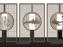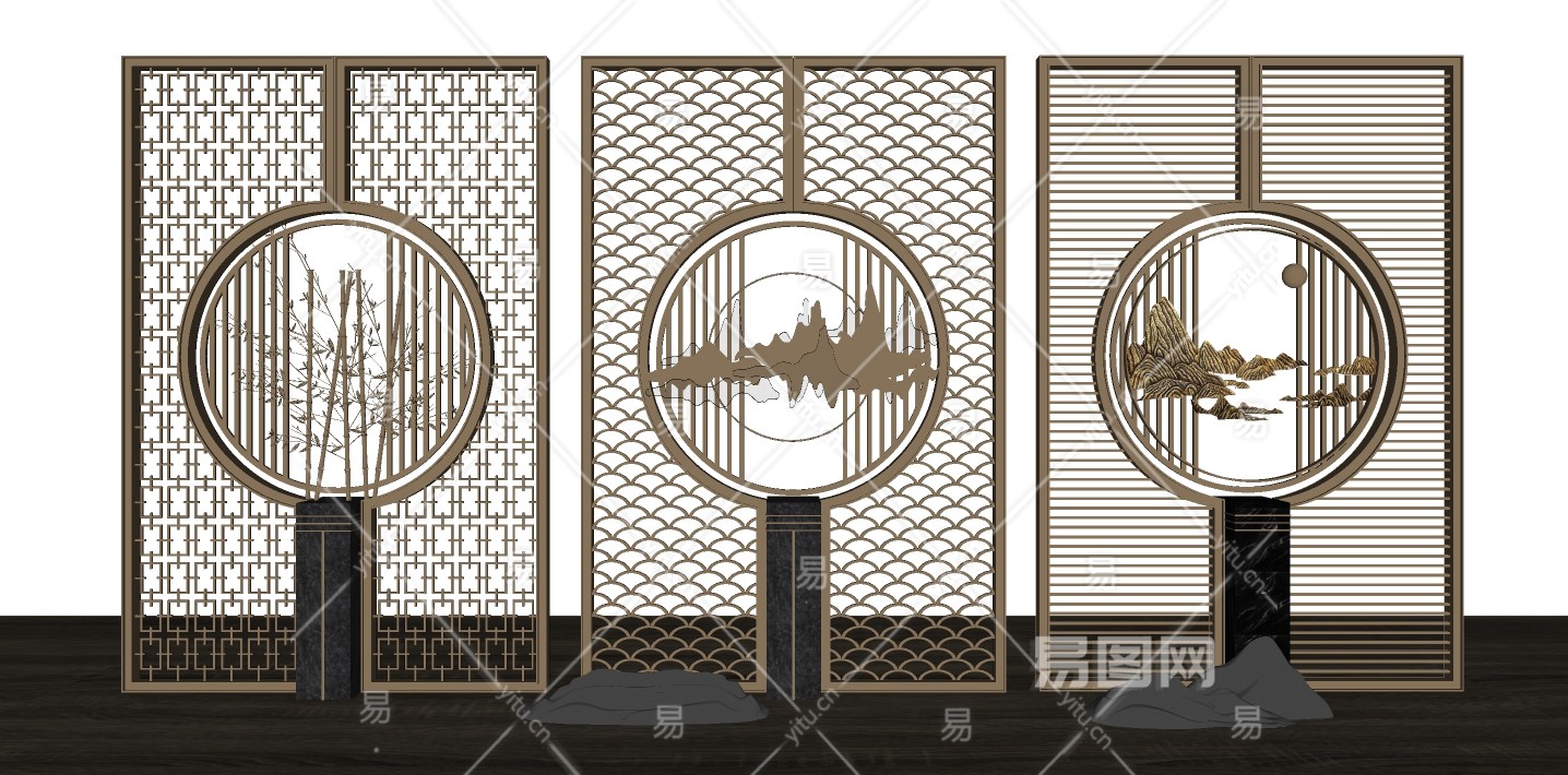 24新中式花格假山屏风隔断 新中式格栅 镂空隔断 鱼鳞隔断 木纹格栅su草图模型下载