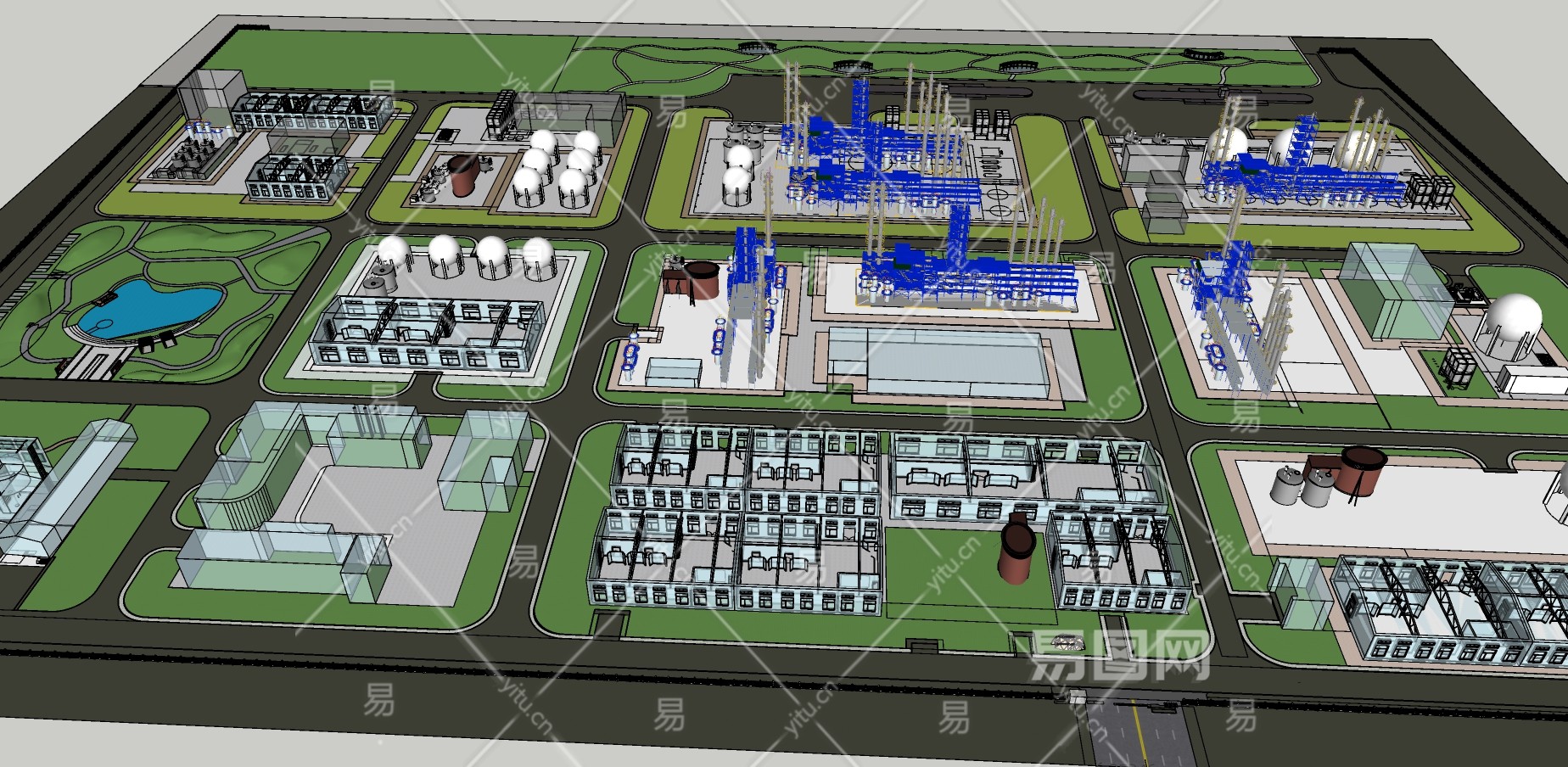 126工业园区总体规划设计 现代风格标准厂房 化工厂 工业厂房 管道 化工厂储蓄罐 化工厂设备 化工产业园su草图模型下载