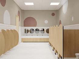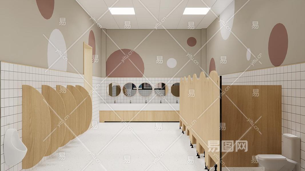现代幼儿园卫生间 格子地砖 卫生间隔断 儿童小便斗隔断