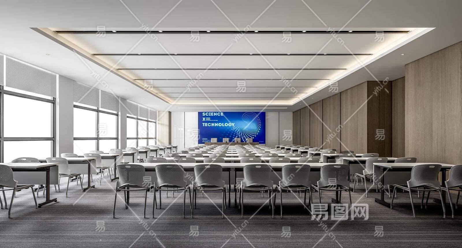 现代报告厅 大会议室 培训室 报告室 多功能会议室教室 讲台 显示屏 培训桌椅
