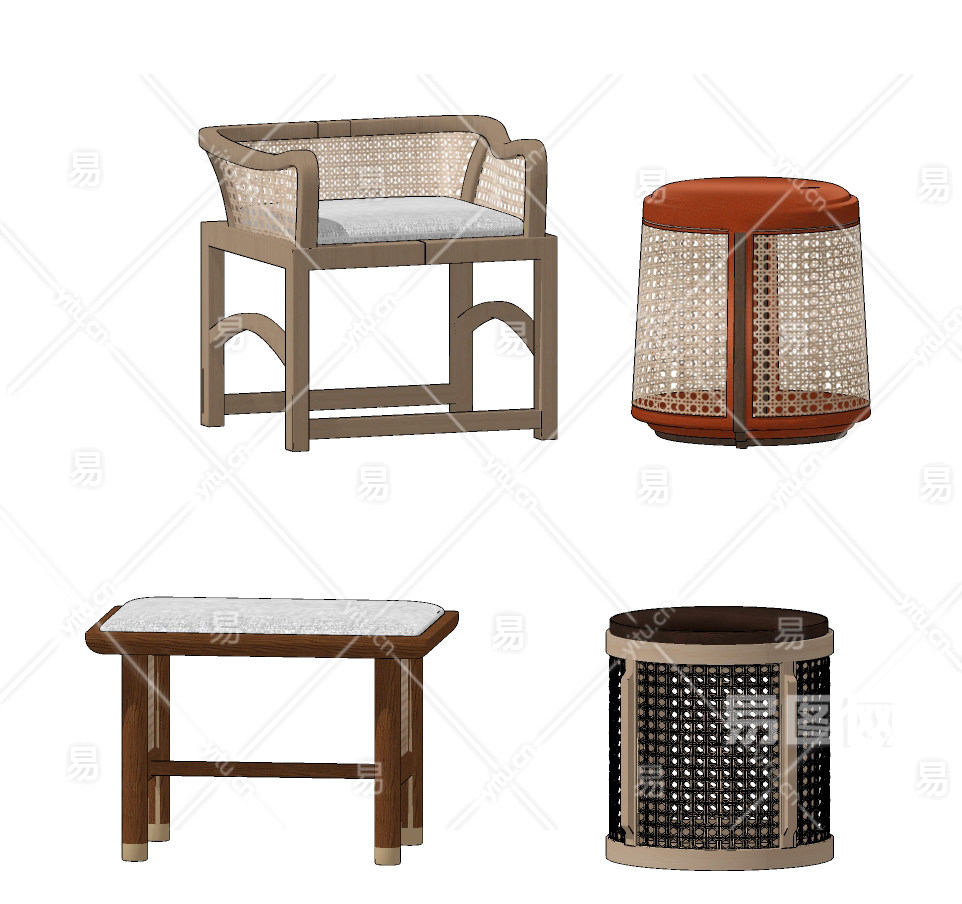 新中式竹编凳子休闲椅,坐墩,凳子su草图模型下载