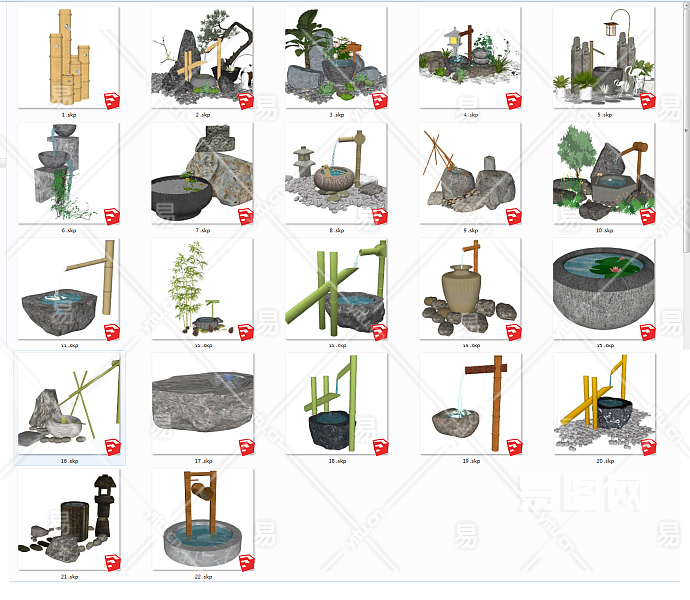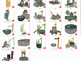 中式日式景观园林园艺小品,水景鱼缸竹子su草图模型下载