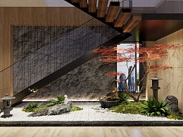 • 现代室内扶手楼梯景观 新中式禅意景观小品 假山石头 罗汉松 蕨类植物 石灯