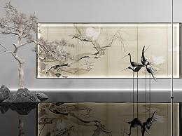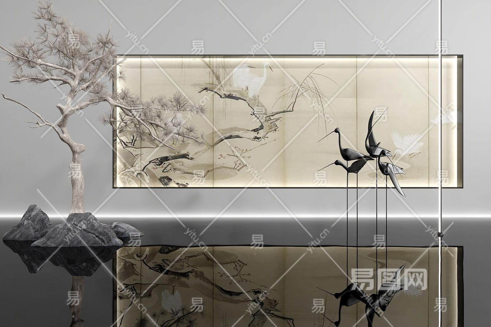 新中式装饰画 水墨装饰画 景观树 白鹭雕塑 假山摆件