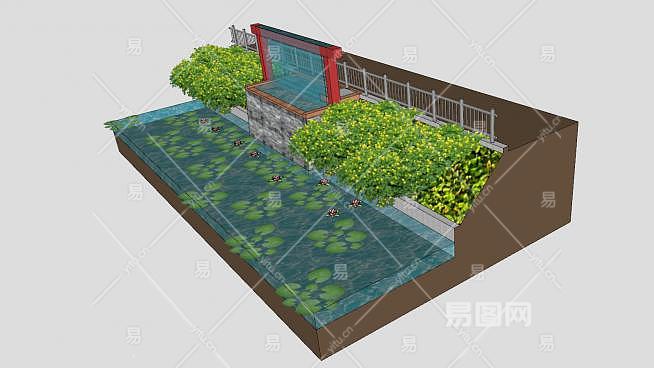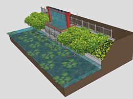 中式水景墙荷花池塘SU模型下载_sketchup草图大师SKP模型