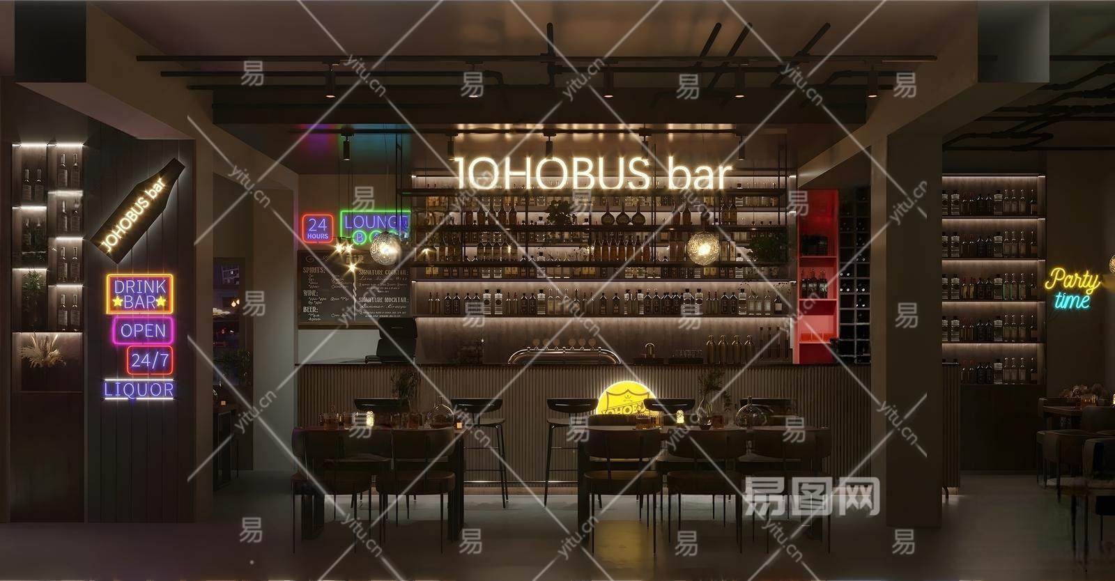 工业风酒吧 餐桌椅组合 吧台凳 酒架 霓虹灯 酒吧工作台