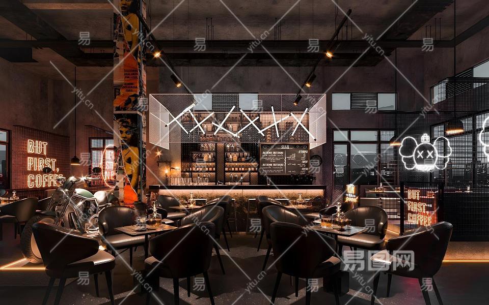 工业风酒吧 餐桌椅组合 酒吧台 吧台凳 酒架 铁丝网