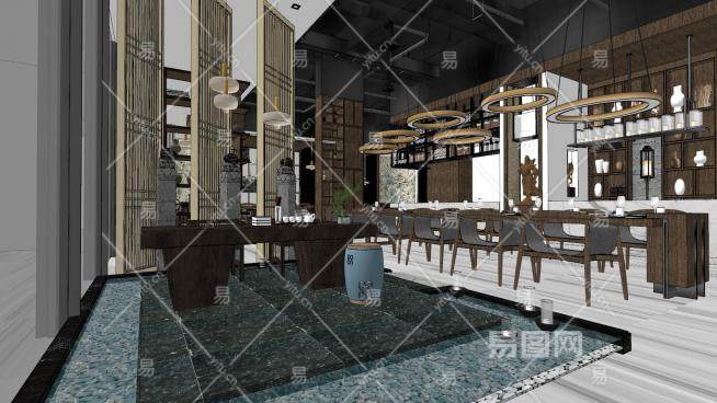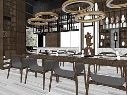 新中式禅意餐厅室内设计SU模型下载_sketchup草图大师SKP模型