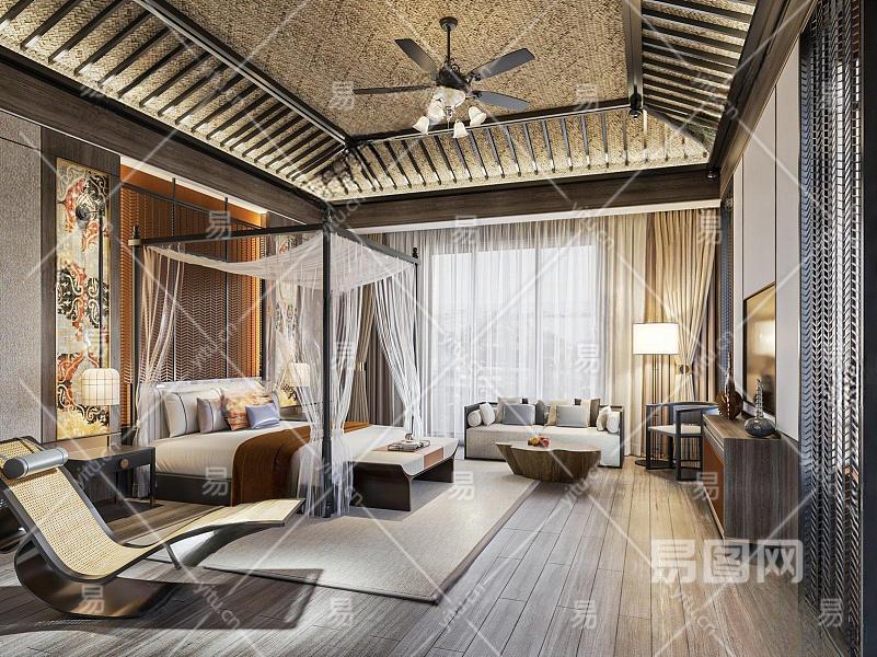 新中式民宿套房 民宿酒店客房 客栈 双人房 斜顶 架子床