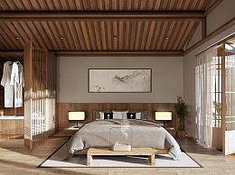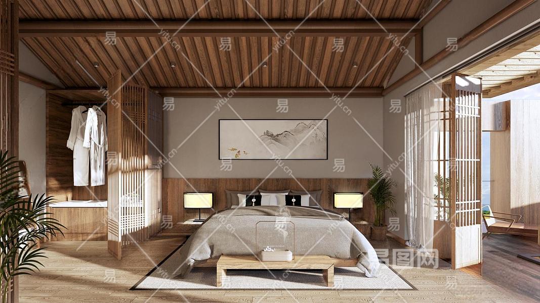 新中式民宿客房 卧室 双人床 床头柜 床尾凳