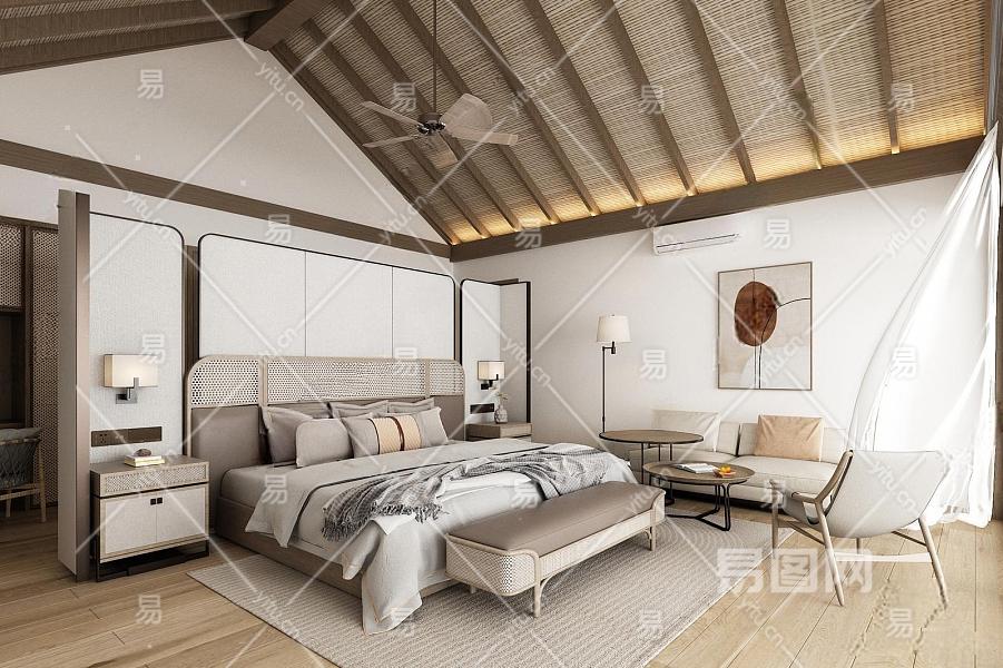 现代民宿客房 双人床 床尾凳 沙发茶几 休闲椅 隔断