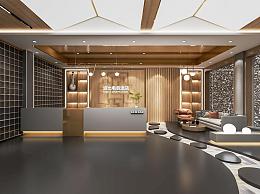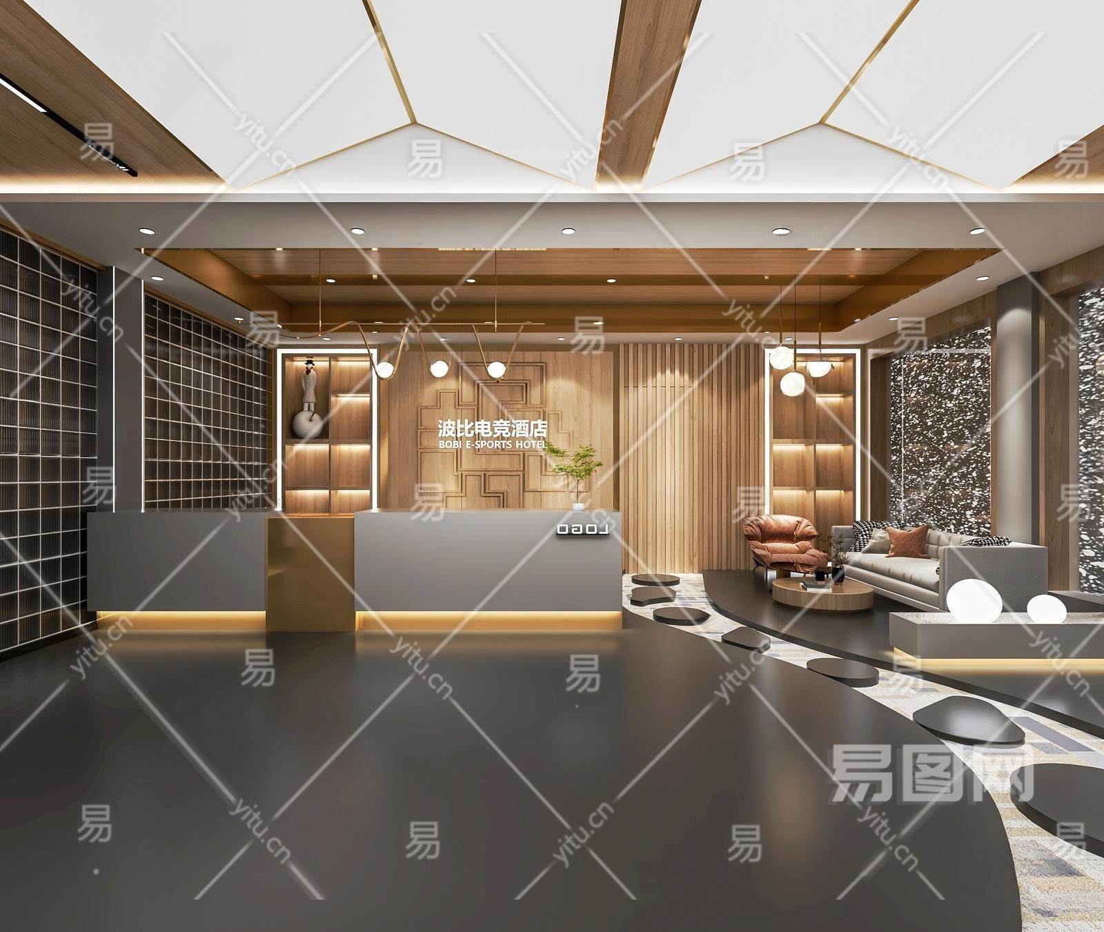 新中式酒店大堂 酒店大厅 酒店前台接待区 前台 收银台 休息区 休闲椅
