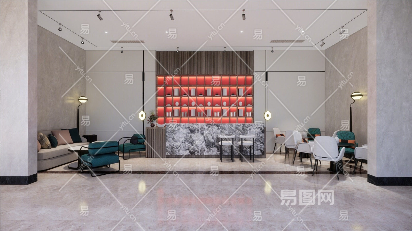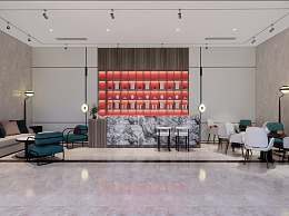 新中式酒店接待区 接待台 前台 书柜 吧台 吧椅 休闲沙发 休闲椅 壁灯