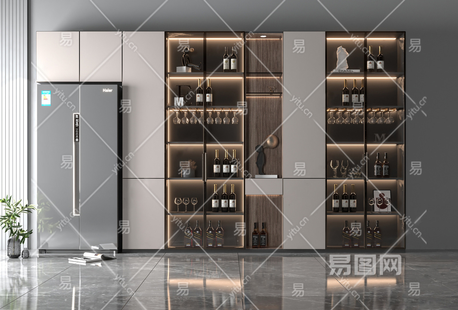 现代酒柜 酒瓶 酒杯 冰箱 摆件
