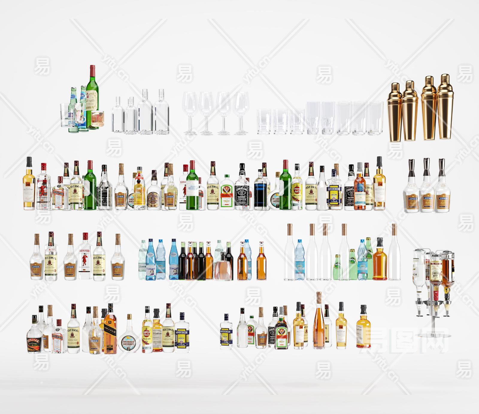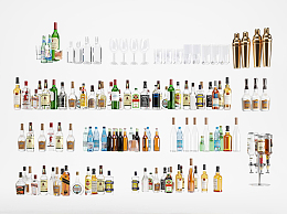 调酒 白酒 啤酒 饮料 柠檬水 酒吧 摆件 高脚杯 酒杯 酒架酒瓶子su草图模型下载